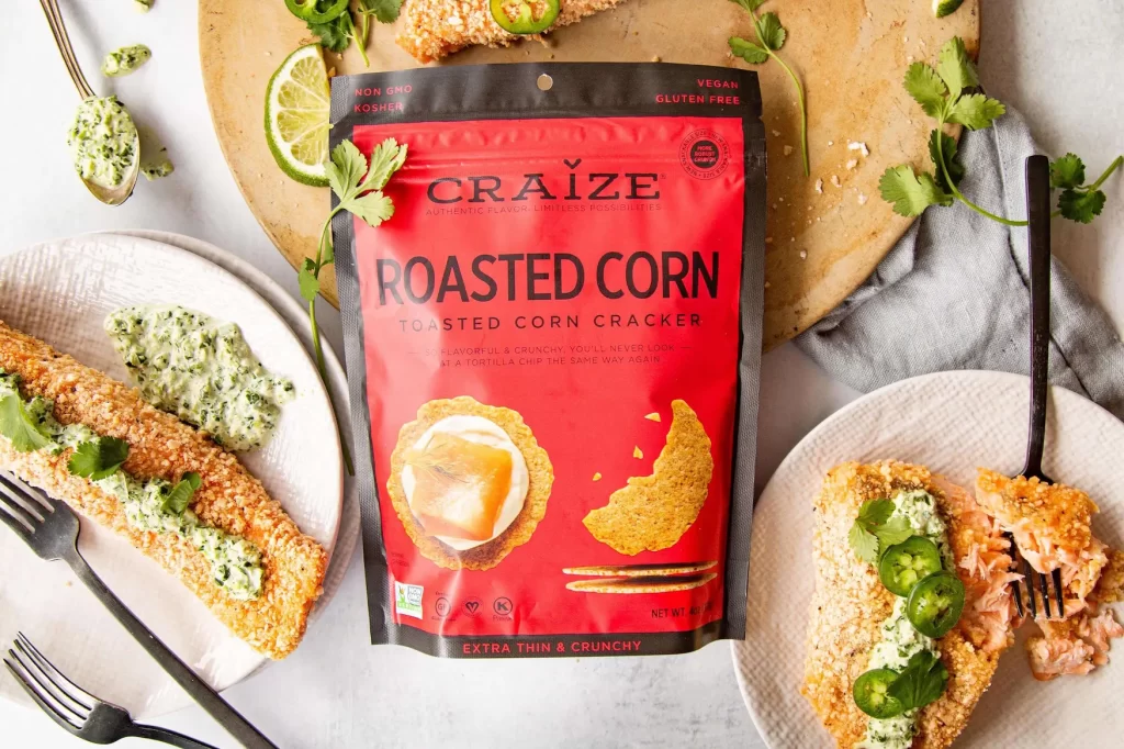 - Pour the bag of Craize Roasted Corn Crackers into a food processor. Pulse until a breadcrumb-like consistency is reached. Pour the cracker crumbs into a shallow dish and add a generous pinch of salt and pepper.