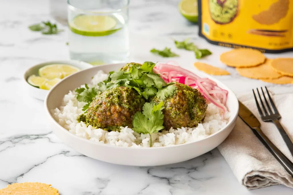 - After the meatballs are cooked, place the mojo sauce into a large skillet over medium heat. Once simmering, add the cooked meatballs and toss. Remove from the heat and serve immediately over rice or alongside your favorite vegetable!