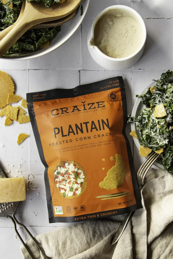 - Drizzle desired amount of dressing over the kale and toss to coat. Top with crushed plantain corn crackers and parmesan and enjoy!